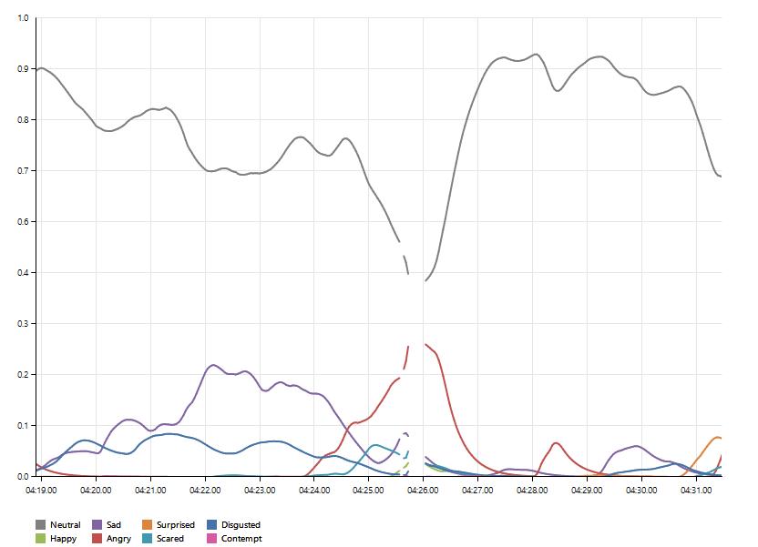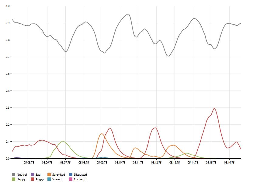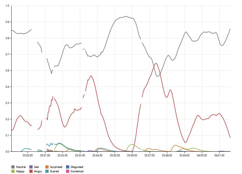 Przyjrzyjmy się trzem wykresom, które umieściłem poniżej, gdyż dobrze uzasadniają one moje obiekcje dotyczące autentyczności zaangażowania pani Godek i jej rzeczywistego zainteresowania kwestią praw osób LGBT (czy homopropagandą, używając jej słów). Ich zestawienie dobrze oddaje różnice między tym, co na prawdę emocjonuje Kaję Godek i tym, co wpływa na nią słabiej. Pierwszy wykres (3:49–4:02) pokazuje wyraziste ekspresje złości, gdy prawicowa aktywista opowiada o lewicowej przemocy wobec wolontariuszy zbierających podpisy poparcia pod dyskutowaną inicjatywą. Drugi (4:19–4:32) wskazuje na znacznie słabsze pobudzenie, gdy mierzy się ona z pytanie Co jeśli dziecko powie, że jest homoseksualistą, co jeśli córka powie, że jest lesbijką, co jeśli syn powie, że jest gejem?, które jest pewnego rodzaju punktem odniesienia dla argumentacji w drugiej części wystąpienia. Wreszcie, ostatni (5:04–5:17) obrazuje przenikanie się subtelnych sygnałów złości, zaskoczenia i radości, kiedy kieruje wobec oponentów najsilniejszy zarzut, oskarżając aktywistów LGBT o bycie odpowiedzialnymi za dramat samobójczej śmierci nieheteronormatywnych młodych ludzi. Nie trzeba być ekspertem, aby dostrzec między nimi różnice.